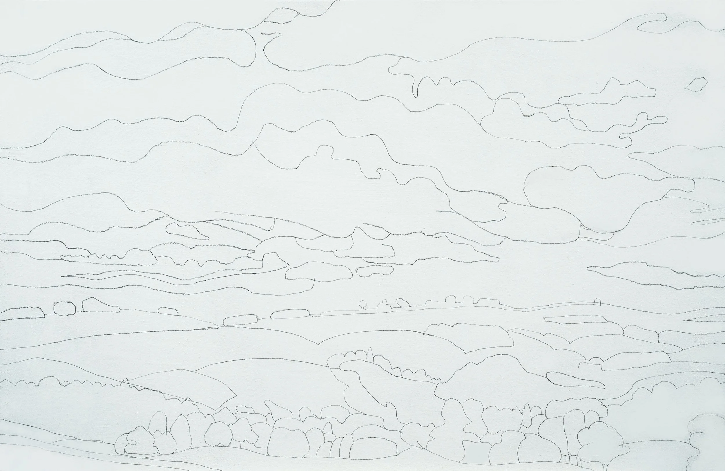 I think the sky is almost finished. I like the space in it which is not easy to pin down and seems to shift around. My initial idea to really tone down the land and trees will be abandoned. I like the mirroring effect of land and sky and will go this route instead.
