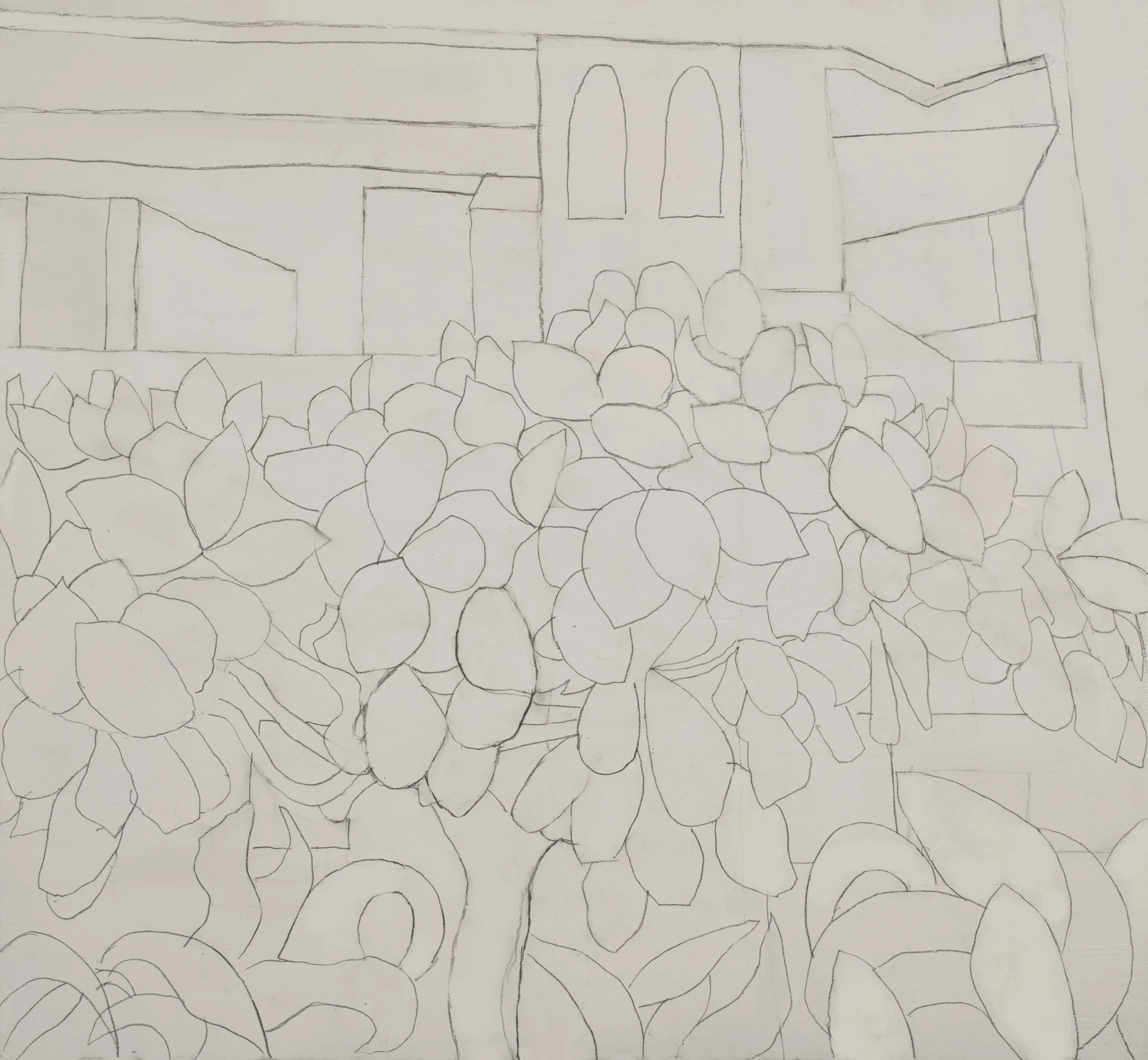I have cheated a little by starting with a high summer photo from last year, just to cushion my return to the UK from Mexico. However, one of my primary intentions of returning to the UK was not to drop the stronger colour palette that is more at home in much hotter climates. I am liking the look of this painting, the colours are saturated but subtle, and I think the space is working well. Its a Byzantine trick of just stacking one object in front of another, I like the effect that has.