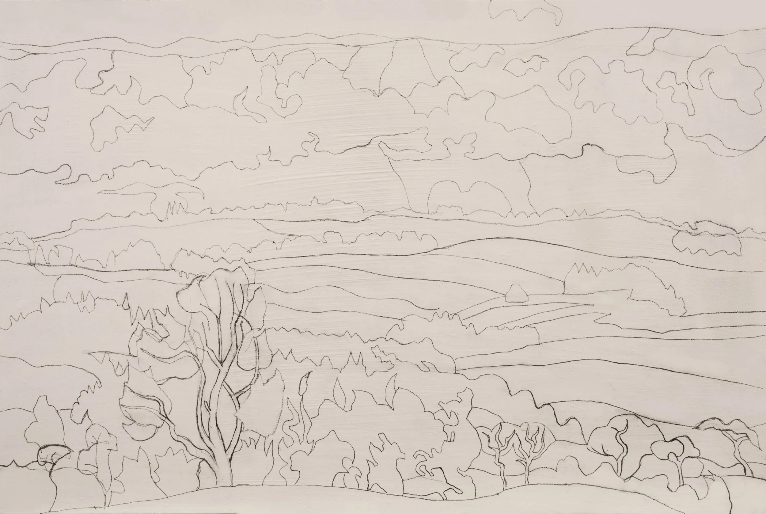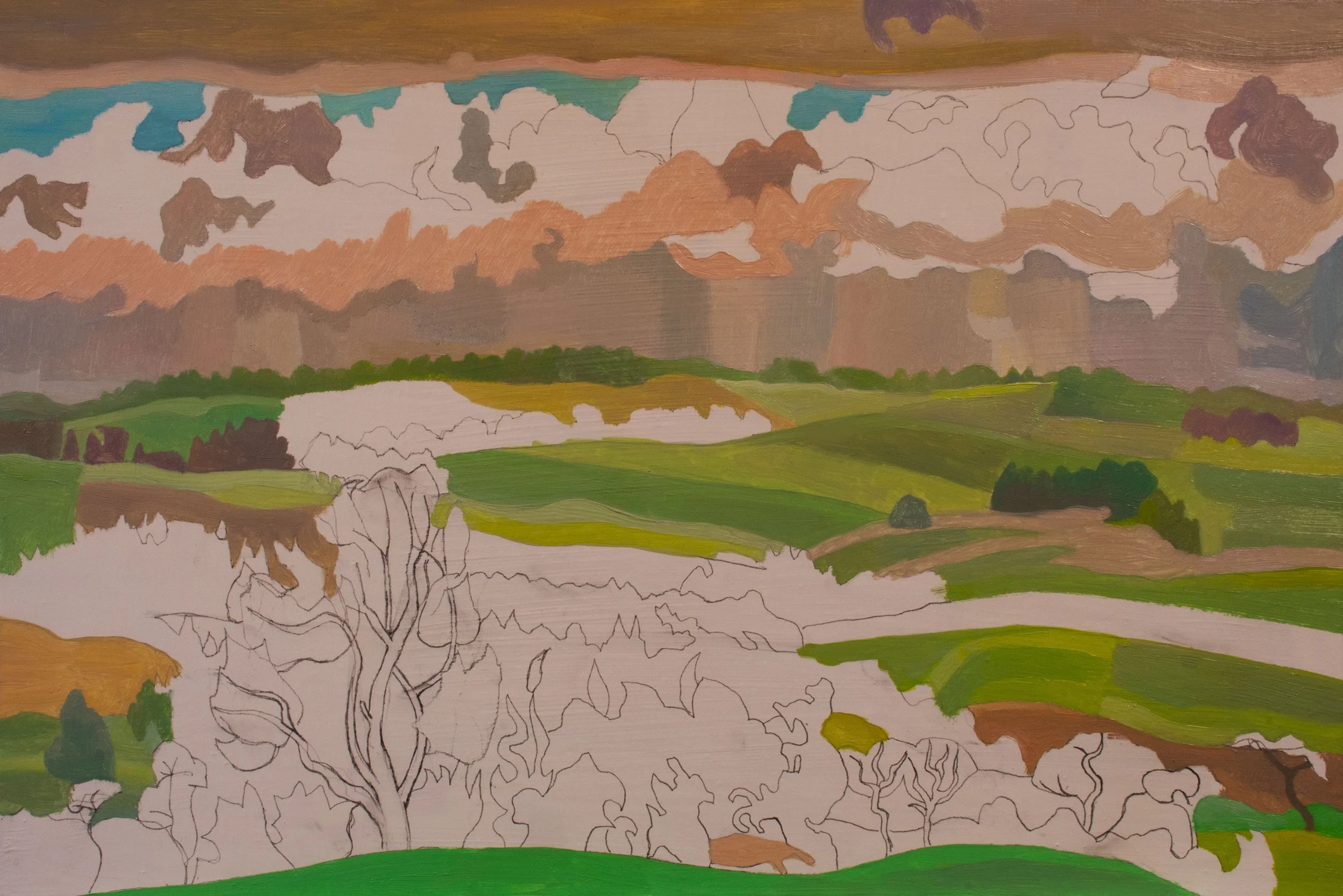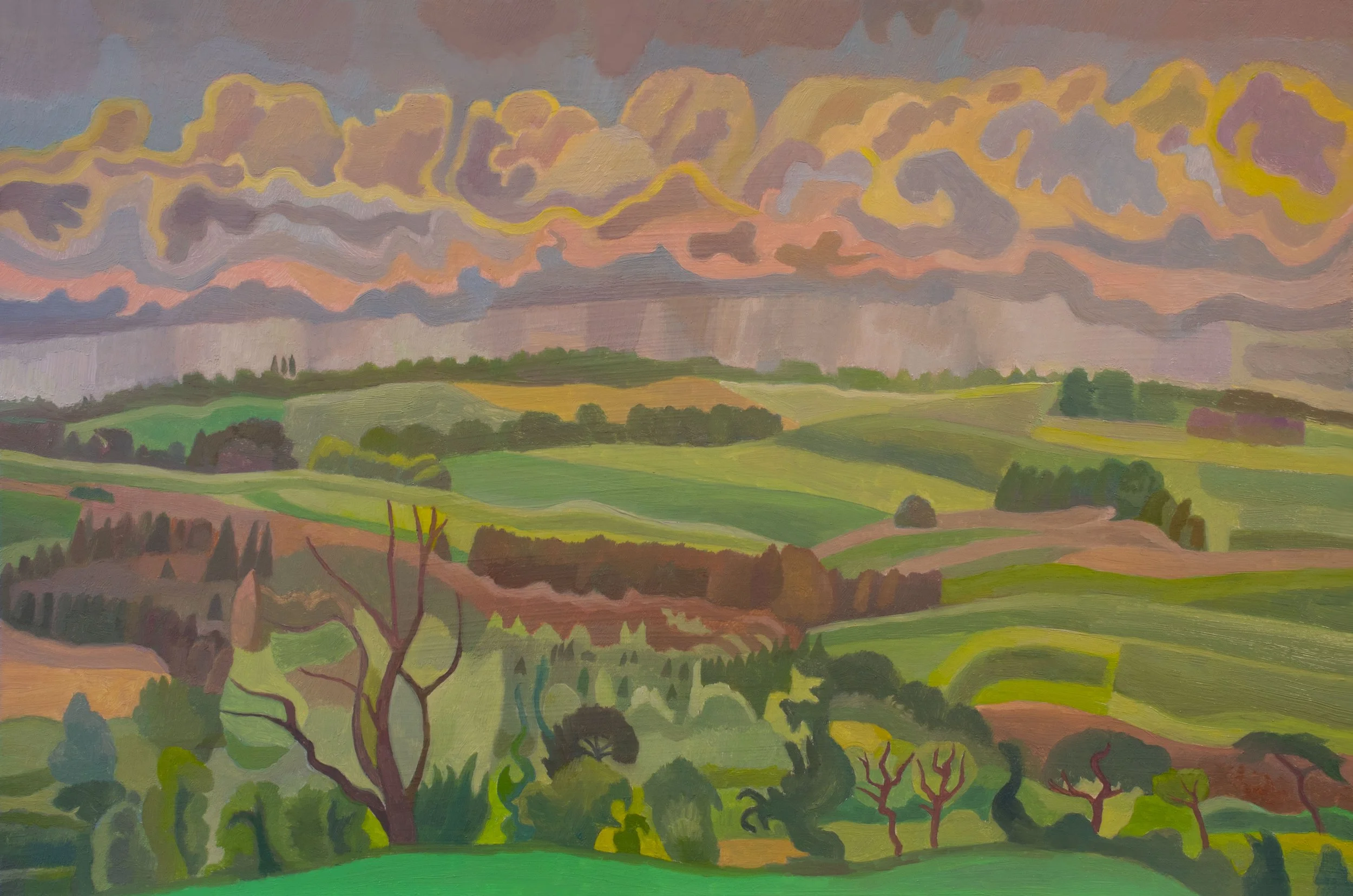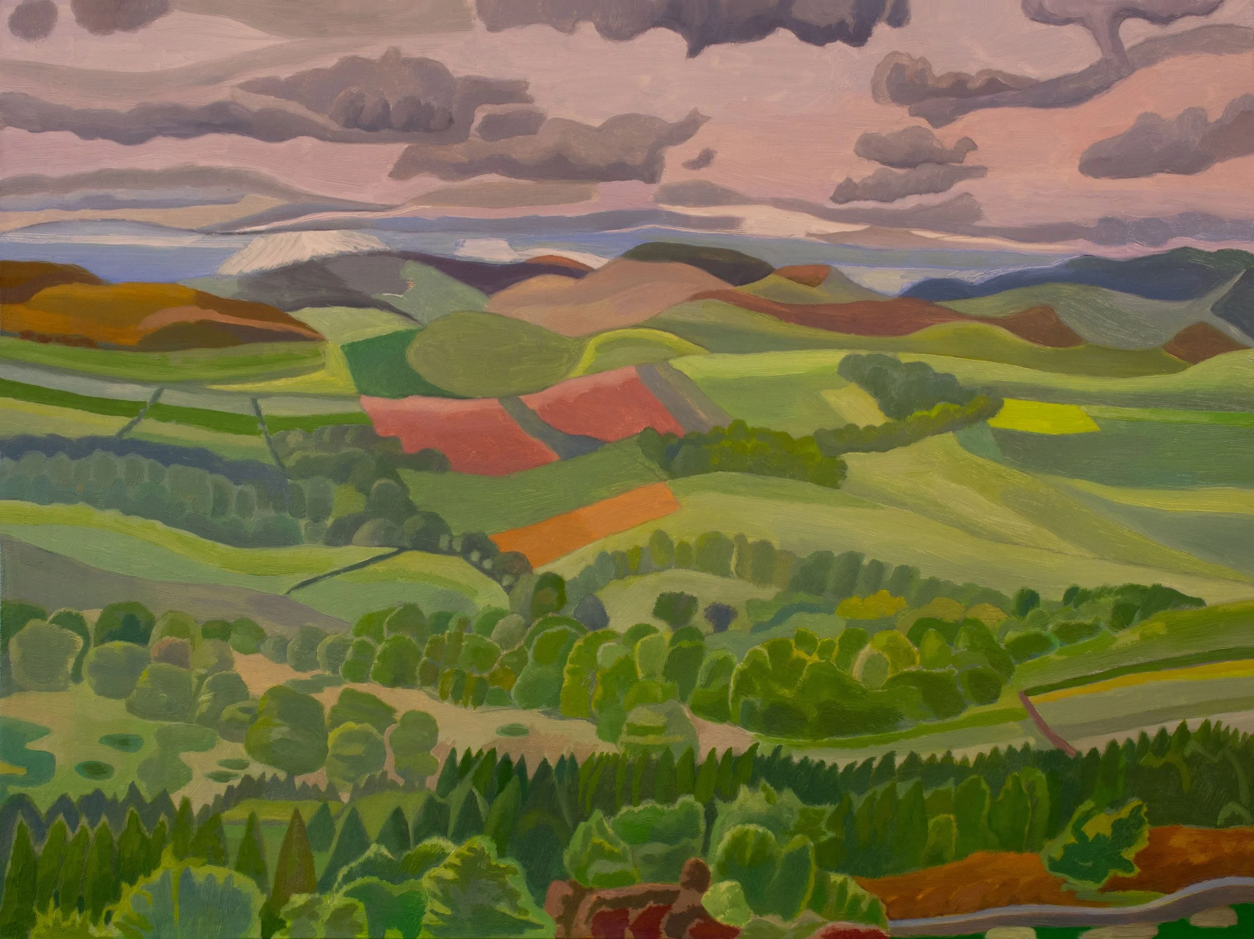 I don’t often turn my paintings into a colourful slurry, its not quite Kossoff like but has the appearance of being worked, which is no bad thing. I am glad I went against sticking to the photo re the sky, it just goes to show, nature can be improved upon!, that’s always the aim with painting but its never easy. It seems to me I like the expansive landscape. I think because it gives me the most freedom to explore space and how the light falls across the land. These elevated views also help with that, the painting is finished.